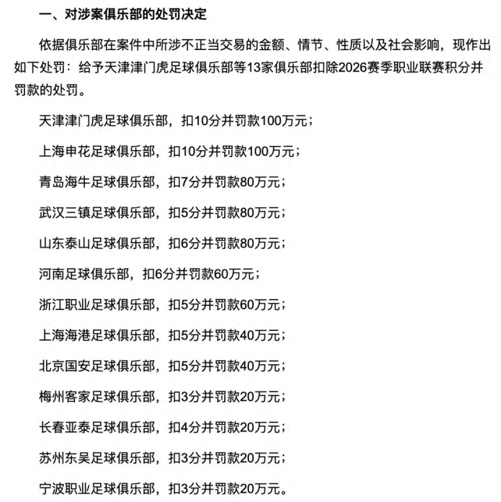 一年畴昔,新足协和中足联缓缓入戏,俱乐部情状渐趋空隙,如今连创记录地闯进决赛的U23国足也踢结束亚洲杯,公布第二份处置令的时机终于持重了。“识大体顾大局”是硬意想,宏不雅上显明利多弊少,仅仅有得必有失,捐躯了某种进度上的刚正性,有俱乐部成为既得利益者,代价是其他俱乐部受损。比拟典型的是,若是第二份处置令在一年前出台,海港就很难完毕中超三连冠,而蓉城大致率将赢得我方的首个顶级联赛冠军。此次处置令公布后的2026赛季开赛前积分榜,领衔七家未受罚中超俱乐部的蓉城高居榜首,表面上仍是联赛冠军最有劲图夺者,可惜从主帅到主将的流失伤筋动骨,他们新赛季磨合任务过重,再现上赛季强势的难度确凿太大。没看法,这便是命。至于处置力度,相隔一年,扣分罚金的数额随机与一年前不尽换取,嗅觉上仿佛罪减一等,左迁的选项被取消了,扣掉的分数和罚走的钱数亦较着低于公论预判,这是另一种不刚正照旧更深档次的考量呢?有一条是不会错的,那便是稳定为先的原则目前没变,以后也不会变。