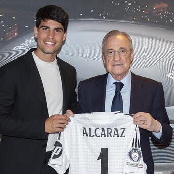 #网坛风浪# 阿尔卡拉斯不雅看皇家马德里的比赛体育集锦,并收到了专属的1号球衣。