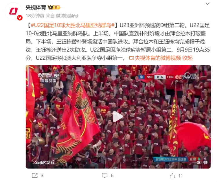 U23亚洲杯预选赛D组第二轮,U22国足10-0慑服北马里亚纳群岛队。上半场,中国队直到补时阶段才由拜合拉木突破僵局。下半场,王钰栋替补登场周转中国队迫切。拜合拉木和王钰栋均完成帽子戏法,王钰栋还送出2次助攻。U22国足因净胜球弊端暂居小组第二。9月9日19点35分,U22国足将和澳大利亚队争夺小组第一。