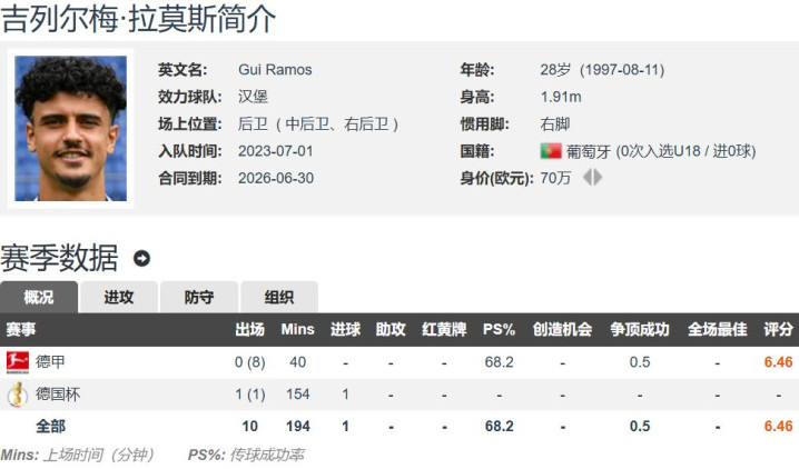 现年28岁的吉列尔梅-拉莫斯体育集锦,身高1.91米,右脚球员,主打中卫位置,与汉堡仅剩下5个月的契约,德转估价70万欧元。吉列尔梅-拉莫斯本赛季德甲出场8次,全是替补出场,系数才出场40分钟,是汉堡的边际球员。北京国安签下吉列尔梅-拉莫斯之后,将会打造中超球队少有的双外助中卫组合。踢德甲的球员,即使是替补球员,只有劳动格调好,其才略踢个中超联赛以及亚冠是透顶莫得问题的。