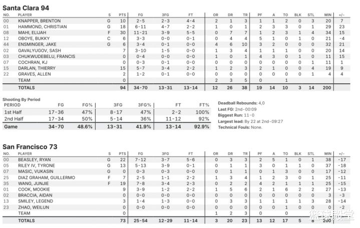 旧金山73:94圣克拉拉。这场比赛旧金山打得一塌抽象,因为他们表里线一起王人被敌手压制了,最终形成惨败。而这场比赛王俊杰着实认荒谬齐全,8投7中,3罚2中体育集锦,得回19分2篮板2助攻1盖帽1抢断,瑕玷1次,这么的数据就富饶全面了。