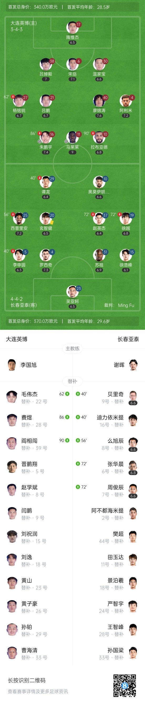 下半场补时4分钟,大连英博2-0长春亚泰。