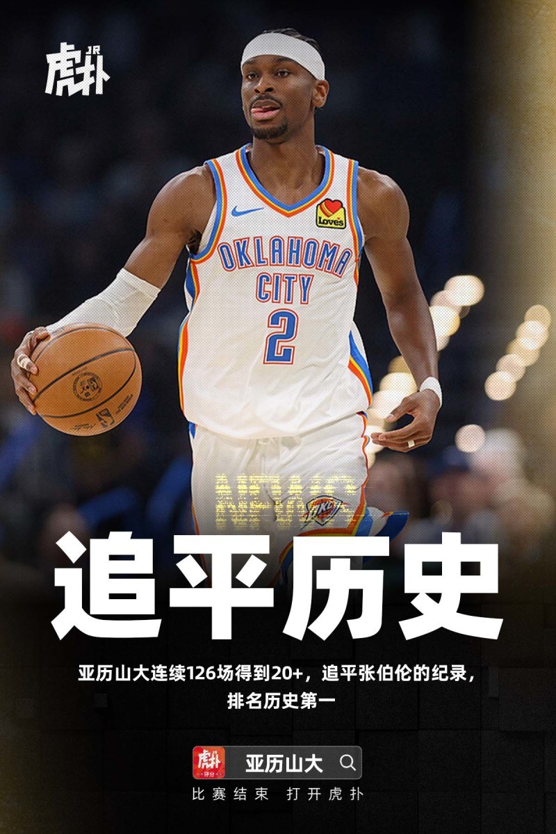 比赛的第三节,亚历山大撤步三分投进,相连126场比赛砍下20+追平张伯伦记载,并排历史第一位。